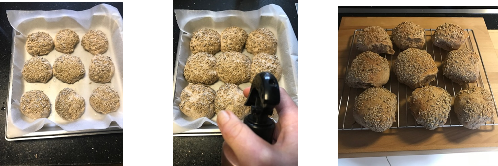 Brötchen mit Wasser besprühen (Blumenspritze) und ca. 25 min, oberste Schiene bei 200°C Ober- /Unterhitze backen.