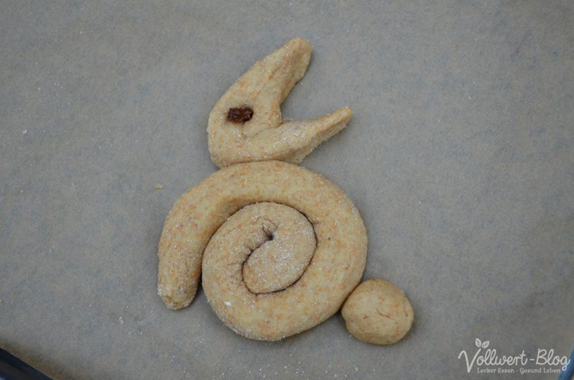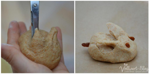 Ein kleines Stück Teig abnehmen und ein ovales Brötchen formen. Mit einer Schere 2 Ohren hineinschneiden. Möglichst schön weit hinein schneiden, so dass die Ohren beim Backen nicht wieder verwachsen. Die Ohren evtl. noch ein wenig zurechtzupfen und noch ein bisschen Hals formen. Für die Augen zwei kleine Rosinen und für das Hasenschwänzchen eine große Rosine in den Teig drücken.