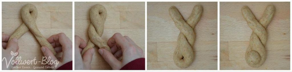 Eine kleine Handvoll Teig (oder weniger) abnehmen und diesen zu einer langen Schlange von ungefähr 20 cm rollen. Dann die Rolle zweimal zusammenzwirbeln. Aus einem kleinen Teigstück eine kleine Kugel rollen und als Hasenschwänzchen unten auf den Teig drücken