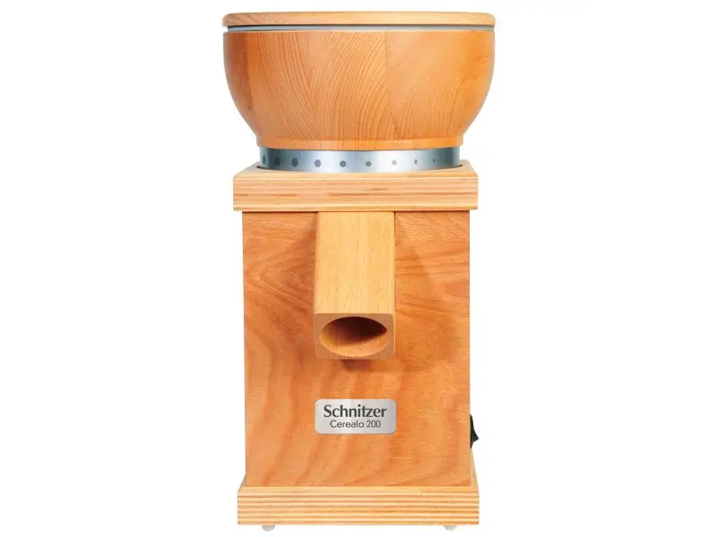 Am Trichter kann der Mahlgrad der Maschine individuell eingestellt werden. Der Trichter fasst hierbei 1400 g Getreide, was etwa 2 kg Vollkornbrot entspricht. Die Mahlkammer besteht aus lebensmittelechtem, sowie BPA-freiem Kunststoff und ist einfach zu öffnen. Sie kann daher per Hand oder in der Spülmaschine gereinigt werden. Das Gehäuse der Schnitzer Cerealo 200 ist zwar aus Buche Multiplex gefertigt, die Mahlsteine aus Korund sind jedoch in Keramik eingefasst.