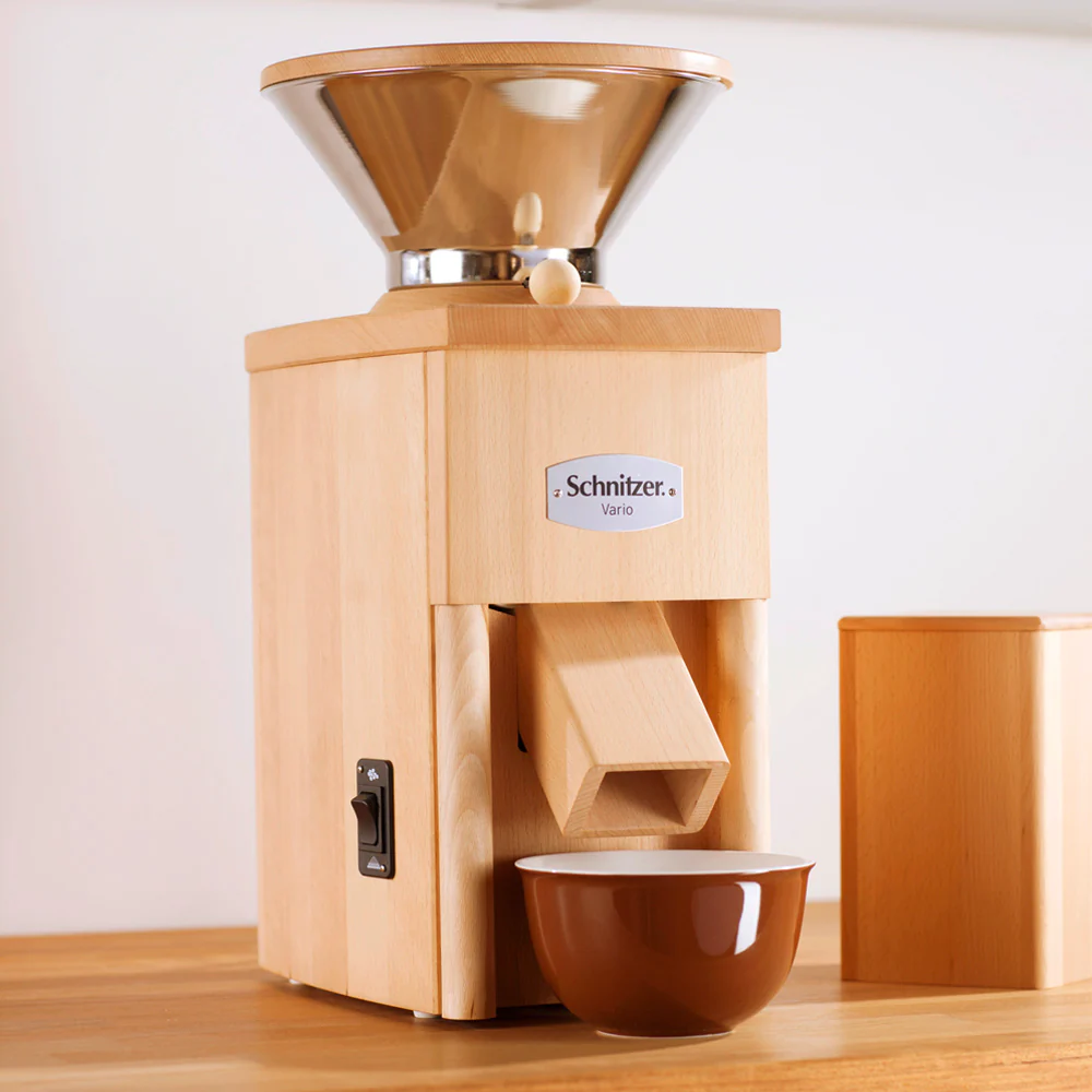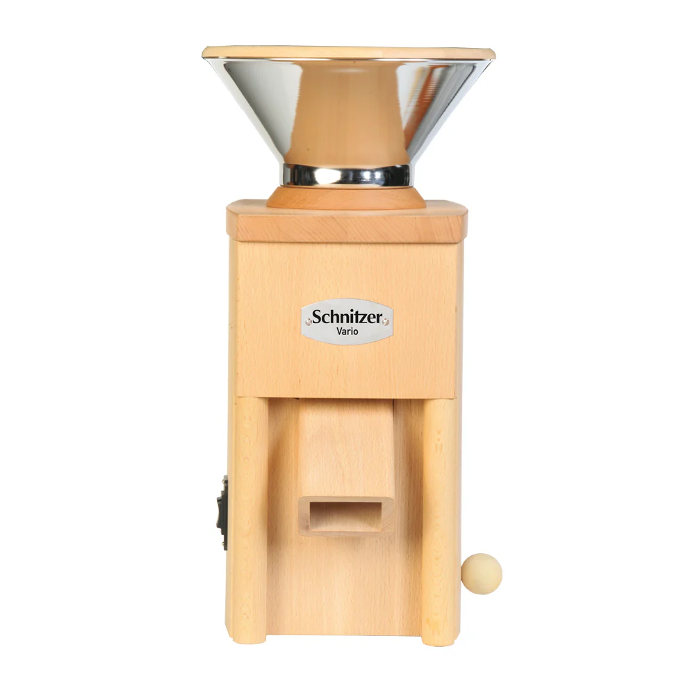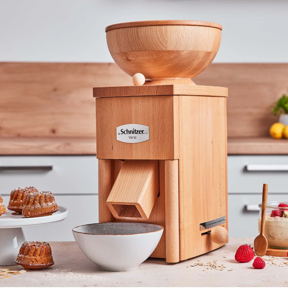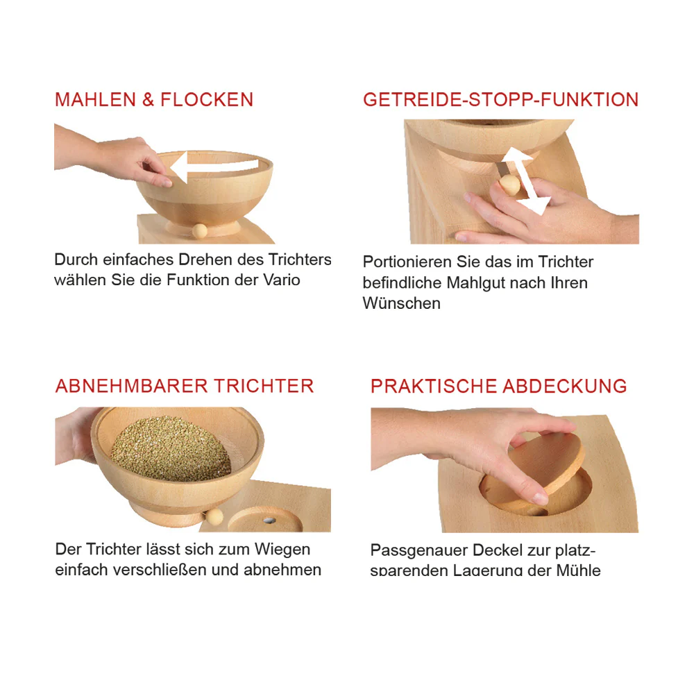 Praktisch, clever … Vario! Die Vario ist die Pionierin unter den Kombigeräten. Sie spart Platz, da sie ressourcenschonend mit nur einem kräftigen Motor auskommt. Die Vario ist eine Meisterleistung des Tischlers aus Buchenvollholz. Das formschöne Gehäuse schmückt jeden Winkel Ihrer Küche. Sie mahlt ca. 110 g feinstes Mehl und flockt ca. 140 g Hafer pro Minute. Getreide-Stopp-Funktion Portionieren Sie das im Trichter befindliche Mahlgut nach Ihren Wünschen. Mahlen oder flocken durch Drehen des Trichters Durch einfaches Drehen des Trichters wählen Sie die Funktion der Vario. Abnehmbarer Trichter zum Abwiegen des Mahlgutes Der Trichter lässt sich zum Wiegen einfach verschließen und abnehmen. Praktische Abdeckung Passgenauer Deckel zur platzsparenden Lagerung der Mühle.